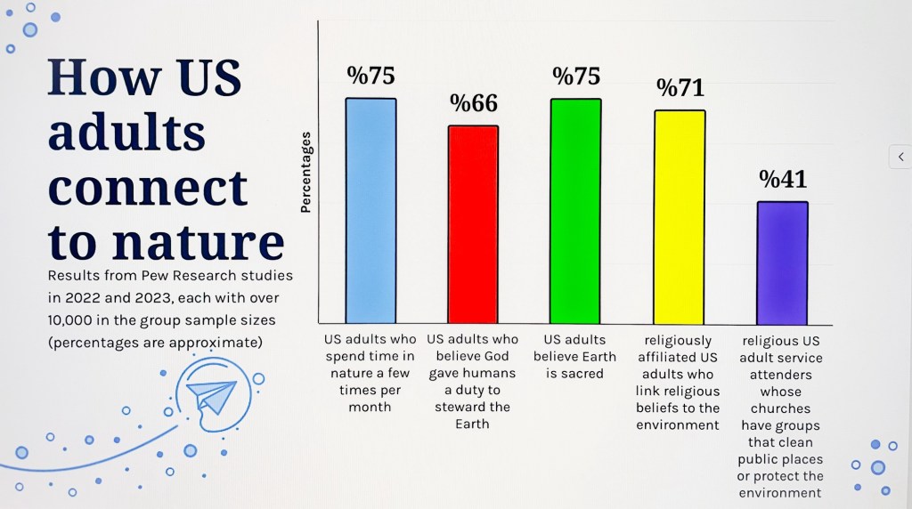 Another study done by Pew Research found that 2 out of 3 agree that God gave humans a duty to protect and care for the Earth and about 75% believe it’s sacred. Pew Research discovered that religiously affiliated Americans commonly link their religious beliefs to the environment and 71% of all US adults say they find meaning in nature. Interestingly, among those who attend religious services, only 41% say their congregation has groups that cleans up public places or protects the environment.